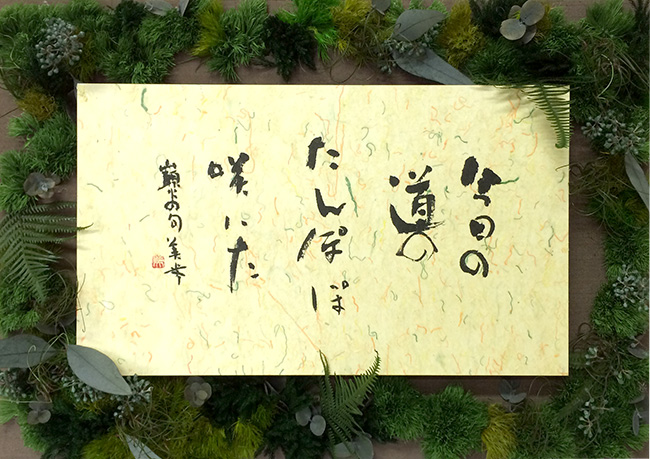 プリザーブドフラワーを作品の周りに飾っていただき、道端に咲くたんぽぽをイメージして仕上げていただきました。立体的な表現になり、新しい書の世界が広がりました。